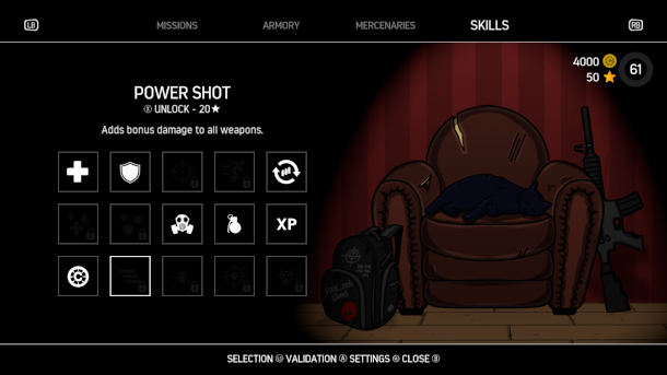 If you don't want to be ripped apart by zombies, think about upgrading your skills! Spend XP tokens earned to unlock new skills.