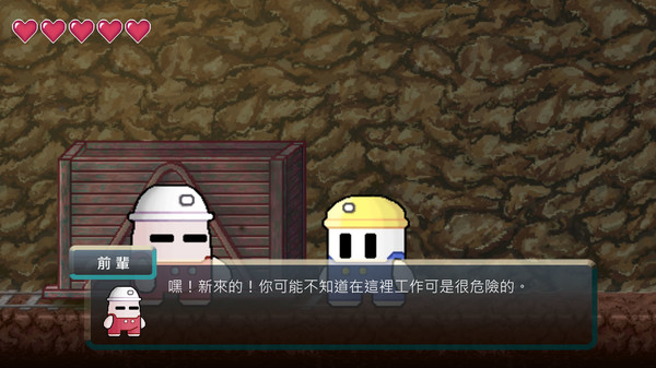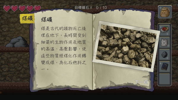 我們在遊戲畫風上使用偏向Q版元素與像素風格,減少玩家因在礦坑陰暗的環境中造成的恐懼感,劇情中帶入礦工生活與歷史,用輕鬆又帶著緊張感的遊戲機制,帶玩家透過遊戲中的打擊怪物、挖掘礦石過程,體驗主角做為礦工可能會遇見的新奇事件或是意外事故。