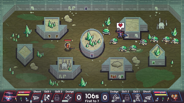 We are a student team with a passion for multiplayer games. Grab your Gun and select a Punk in local or online 1v1 BULLET-HELL ROGUE-LIKE gameplay! With each round, players pick their upgrades and create a better build to defeat their opponent. Use character guns, skills, and abilities to WIN.