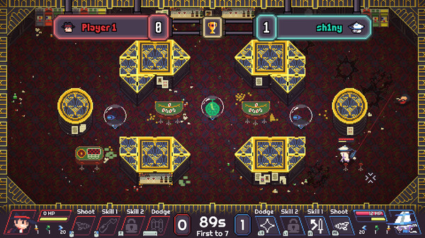 Choose items between rounds to power up your punk further. The longer you play, the more havoc you can create for your opponent. Pick items that increase stats. Some items even allow for added effects to your attacks, like allowing all bullets to explode!