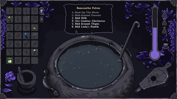 Brew: Work the mortar and stir the cauldron in a satisfying minigame that is easy to learn but hard to master. As your skills grow, your potions will become more potent and valuable.