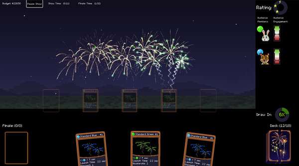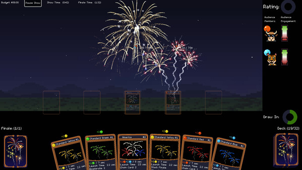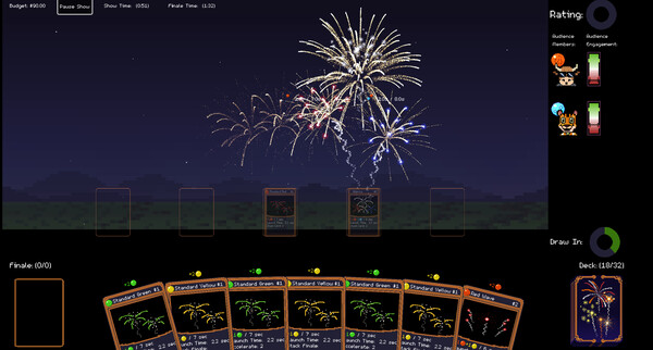 Ignite your strategy in this turn-based, roguelike deckbuilder where every card creates a dazzling fireworks display. Open card packs and collect powerful artifacts as you explore the market square and craft your perfect deck to captivate your audience!