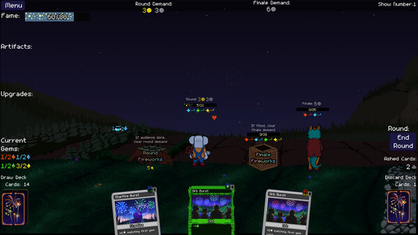 In this captivating roguelike deckbuilder, use your fireworks to entertain and meet the demands of your audience. Explore the bustling market square, collect powerful artifacts, and craft the perfect deck to leave your spectators in awe!