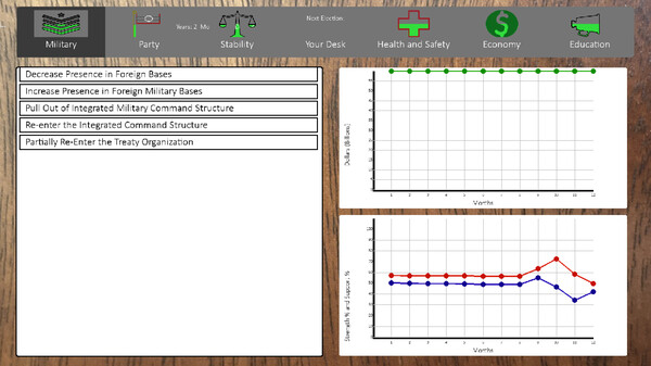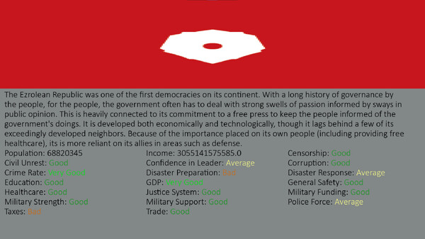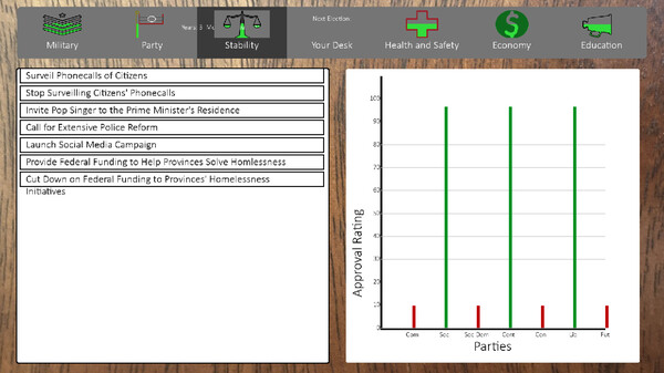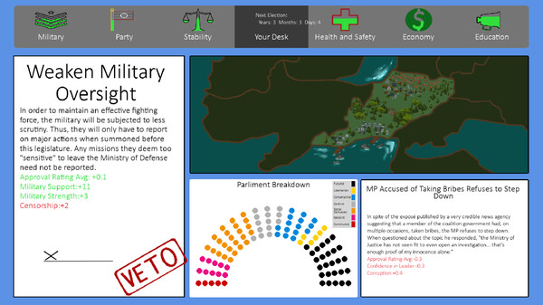 The game has Become the Prime Minister of one of many nations, each with its own strengths and weaknesses. You must keep your job by balancing the agenda of the various parties forming your coalition while also ensuring that your country stays healthy through various decisions. Will you pursue free market capitalism, install a planned economy with workers at the forefront, or strike a balance between the two? Will you form a brutal police state or pursue individual freedoms for all your citizens? The choice is yours...