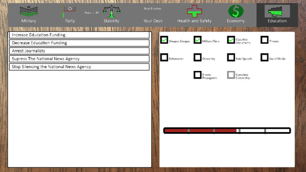 By approving or vetoing Bills and Executive Orders from all sects of the political spectrum, you must ensure that values intrinsic to national health, such as the strength of the military and the quality of education, maintain balanced. You also need to make sure that you're doing enough to make the people want to keep your party in power.