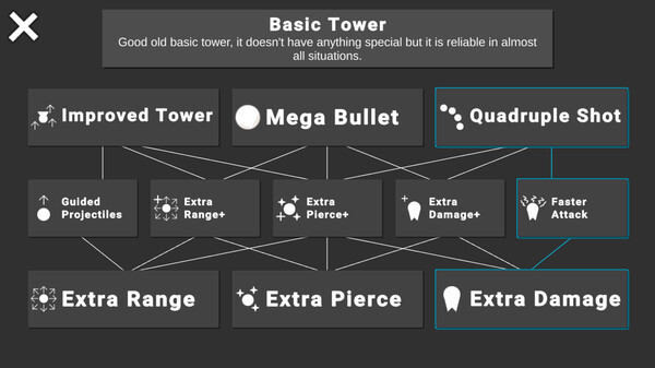 Are you tired of boring choiceless upgrades of tower defenses? Geometric Paradox Td has you covered! Thanks to the skill-tree-like upgrade system, you can choose one upgrade for each upgrade tier per tower allowing for hundreds or even thousands of possibilities and combined with all the different towers and positions, the possible strategies are endless!