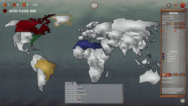 Navigate through interactions with competing powers to lead your nation to global domination in this 4X open sandbox geopolitical sim set in post-WW2 alt-history world. You have 251 years at your disposal to conquer and unify the planet or take your nation into space. Can you make it?