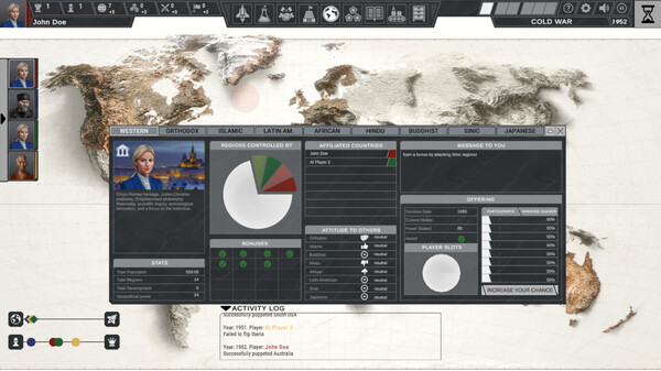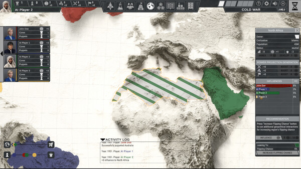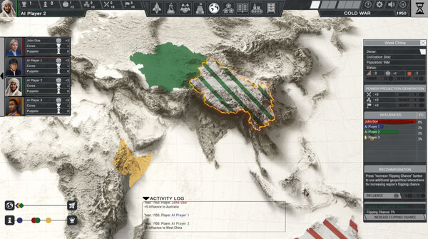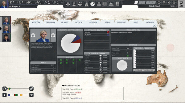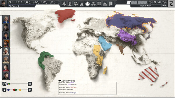 The game has Navigate through interactions with competing powers to lead your nation to global domination in this 4X open sandbox geopolitical sim set in post-WW2 alt-history world. You have 251 years at your disposal to conquer and unify the planet or take your nation into space. Can you make it?