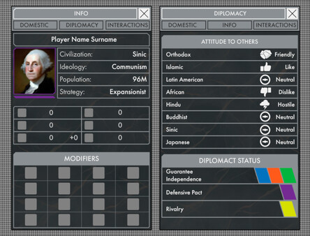 Establish your nation with initial traits determined by its association with a particular civilization and ideology. As you progress over 251 years, your other choices will further shape a distinct nation with its own unique traits.