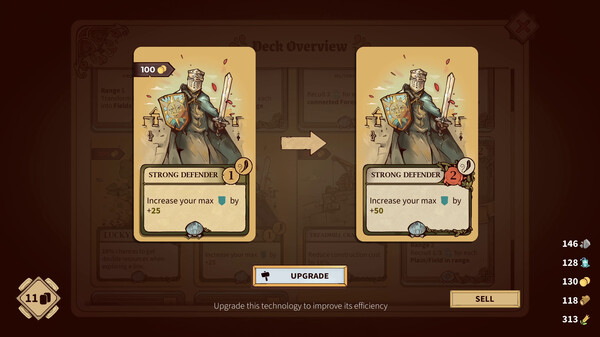 As you progress on your run, trade with markets or guilds to acquire valuable resources, use them wisely to upgrade your deck, make strategic decisions, and choose your path for the next round.