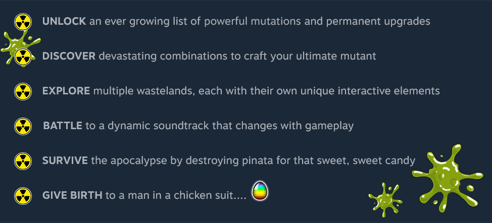 Destroy screen-filling mobs of mutated wildlife, absorb their radioactive guts and become an overpowered freak of the wasteland!