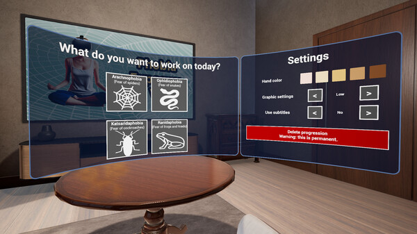 Tailor your exposure therapy to your specific needs. Choose from a range of phobias to work on, adjust the pace of progression, and utilize the option to hide triggers when needed. Take control of your therapy journey in a way that suits you best.Different phobias to work on