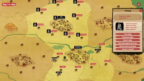 In a world teetering on the precipice, with rebel forces reigning supreme, you must choose your path to power. Beseech the imperial court, marshal your own forces, employ the arts of diplomacy, or even sow discord and coax the rebels to surrender, all in the pursuit of quelling the rebellion. Triumph, and the rewards of glory and titles await; falter, and clandestine alliances may sway the balance of power.