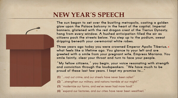The game has Step into the shoes of Emperor Apollo Tiberius, last of his name, in this fictional Cold War era text RPG. As emperor you must allocate the government budget, set ministerial policies, enact royal decrees, make deals with friends and foes alike, and respond to critical events that can change the course of history. Powerful factions grow within the Empire, and amidst these uncertain times, divine right is no longer enough to stay in power. You must gain allies at court, or risk sharing the fate of your father, and his father before him.