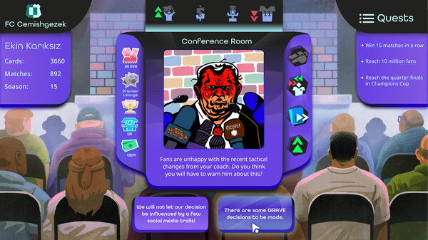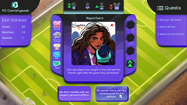 Make strategic choices, and climb through the amateur league to the first while making hard decisions to set everything in line for your club. Every choice matters and will affect future encounters. How will you decide on them?
