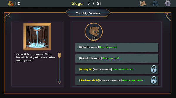 Recruit up to four procedurally generated allies, each with their own deck and unique attributes. Empower your party by defeating elite enemies and collecting powerful "States"—buffs that impact your entire run. Navigate procedurally generated dungeon maps, making strategic choices on when to battle, heal, shop, or retreat.