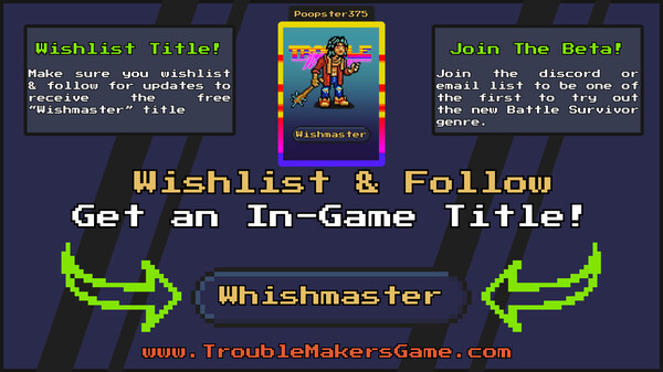 Trouble Makers is the first & only BATTLE SURVIOR where causing chaos is your path to victory. Survive as long as you can, but more importantly, create trouble for your opponents. Dive into 4-player free-for-all showdowns, unleash TROUBLE, and wreak havoc while trying to survive!