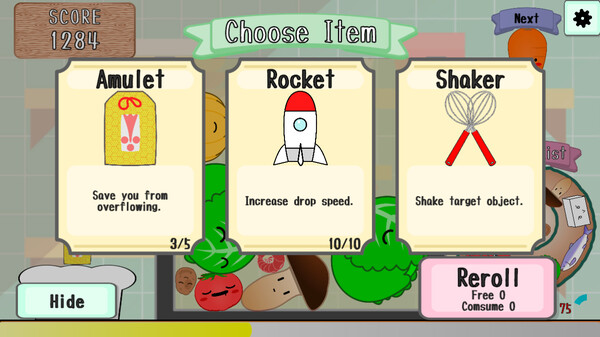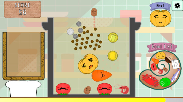 Drop cute foods into a hot pot, merge them, and try to get higher score until foods overflow out of the pot.