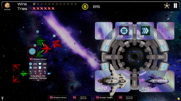 Each round you will receive more credits to purchase the best ships or improvements for your strategy from the shop's random assortment. Create a powerful fleet not only by selecting the right spaceships, but above all by arranging them. Because each spaceship has its own advantages and disadvantages and can influence others in the vicinity. Optimize your fleet by merging spaceships to create new variants with stronger and combined effects.