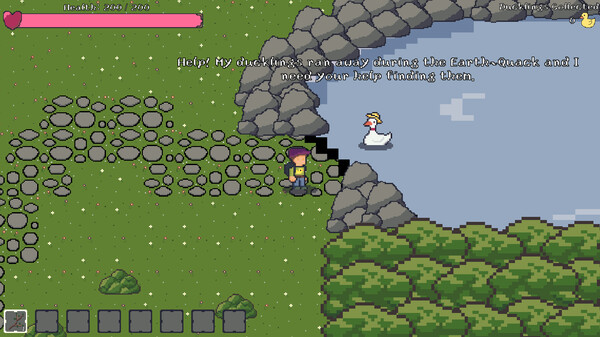 The game has Earth~Quack is an adventure focused game with some survival elements where you play as a young boy on a mission to save a group of lost little ducklings and return them to their worried mother. As you journey through these lands you will encounter many things that will both help and hinder you in your quest to save the ducklings: