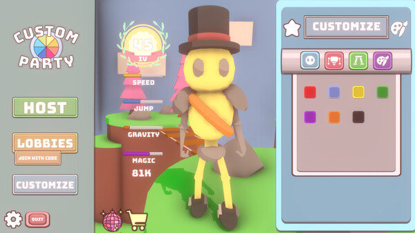 Custom Party is a free indie party-game. Players can use different powers (dash, explosion...) and have different stats based on their character customization. It introduces an innovative ranking system named «Take a Risk». The game allows everybody to play in the playstyle they want.