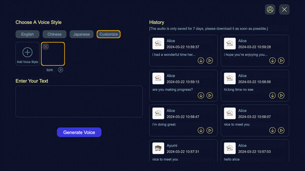 Easy to use, just one click away! Simply choose your desired voice style, type your text, and voila! Your audio file is ready to roll. Experience powerful voice replication! Upload a 3-10 second audio clip, and presto! Get 80% similar voice output.