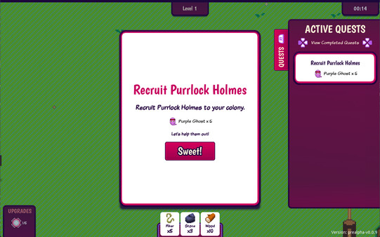 Aliens have come to The Planet! Help Kitsy Katsy survive the tides of oncoming otherworldly enemies to harvest, recruit, build, upgrade, and craft the way to victory! Hmm? What's that? Was that name picked by a toddler or something? Why yes! Yes it was. Thanks for noticing! And you can expect plenty more exquisitely high-quality content like that to come.