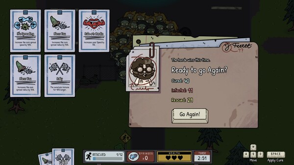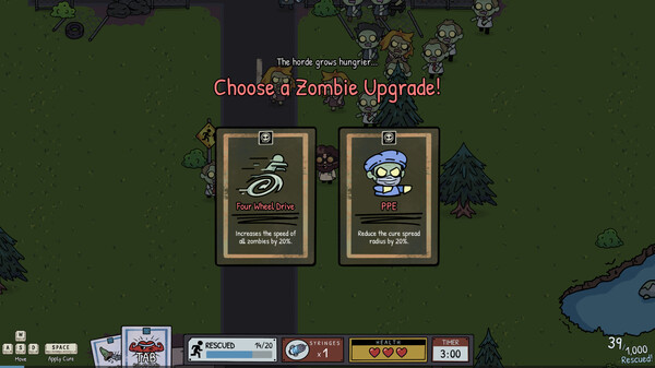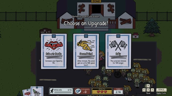 You can expect a roguelike gameplay experience where you are racing to apply the cure faster than the zombie virus can spread. By rescuing those you can, you'll be rewarded with a variety of upgrades to improve your abilities and keep going! But be warned... the virus seems to be mutating so be prepared to face tougher challenges as time goes on!Cure Humanity and lead them to safety