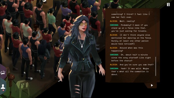Ad Memoriam is an in-development mystery game about a band with a curse: at every single one of their concerts, someone dies in an accident. When Erica - Ad Memoriam superfan, amateur detective, and Alicia’s best friend - becomes the next victim, Alicia realizes that the deaths may not be as accidental as they seem. Play as Alicia while she follows the band and the trail of bodies that they leave behind, and discover the truth in Ad Memoriam's history.
