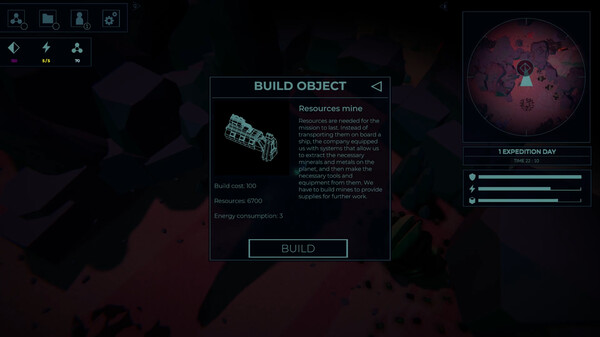 One of your tasks is to expand the base, You decide what to spend the acquired funds and how to further develop the base and the research mission. Acquiring energy, researching new technologies, using minerals found on the planet, also building mines, refineries, power plants and laboratories becomes essential.