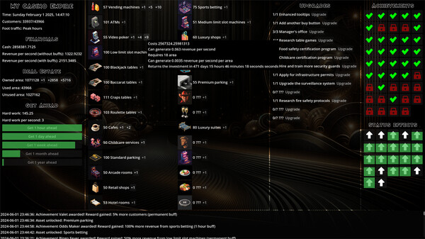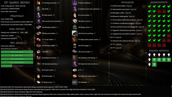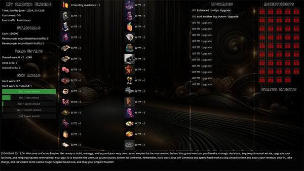 The game has Buy real estate to expand your casino, invest in assets that attract customers and generate revenue, buy upgrades, unlock achievements, new assets and new features along the way. Where does it all end?