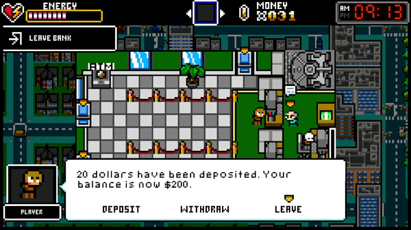 Earn a living within Retroronto by engaging in minigames representing urban professions. Deposit your hard-earned cash at the city’s banks to stay on top of your rent and expenses.