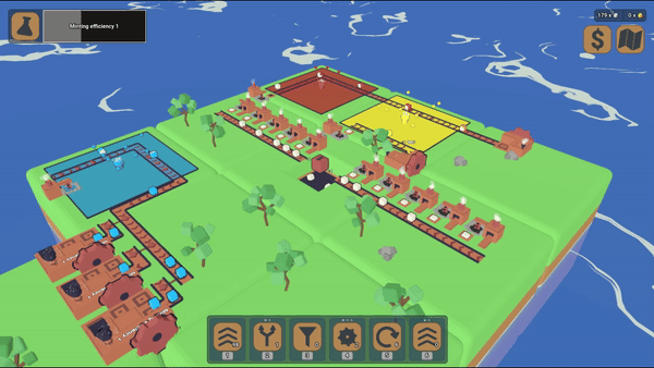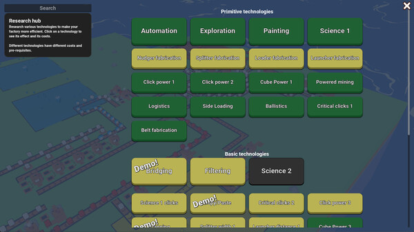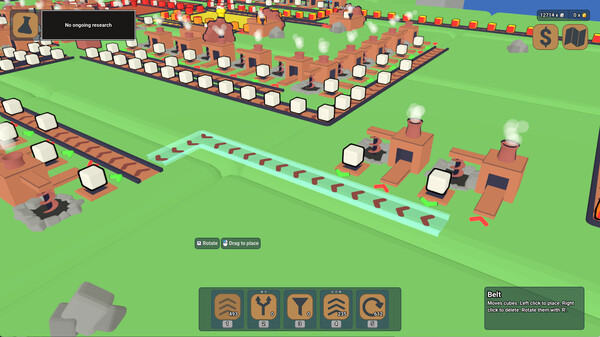 The game starts as a clicker, and slowly morphs into an automation game as you conveyor belt the clicks away. You start on a tiny island with only the money cube to click on. As you earn coins, you can purchase upgrades and machines. These machines unlock the manufacturing part of the game, which is all about painting cubes and combining them to create additional research packs.