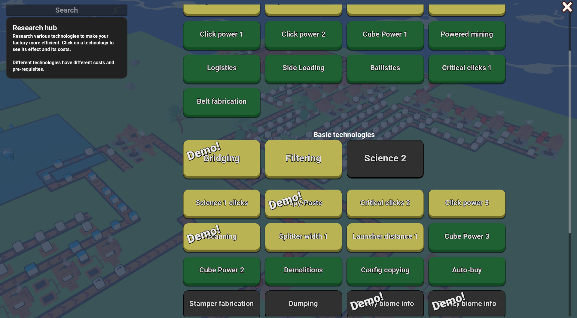 These research packs are used to research new upgrades from a list of 100+ upgrades, ranging from more powerful clicks, to copy pasting your builds, to removing trees and rocks that pepper your island.