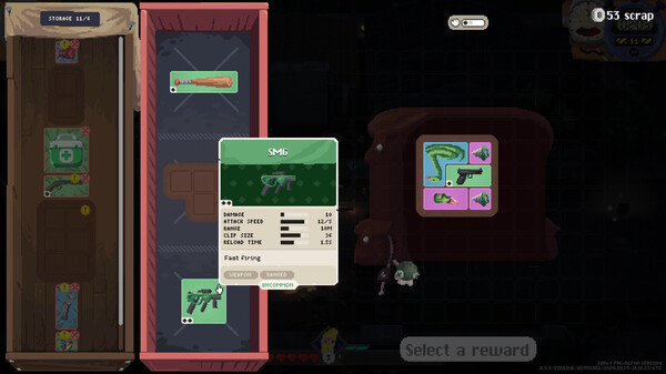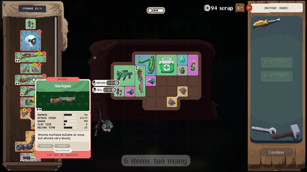 Arrange your weapons and items in such a way that you maximize synergies.Use your workbench to craft new gear or increase the rarity level of your items.