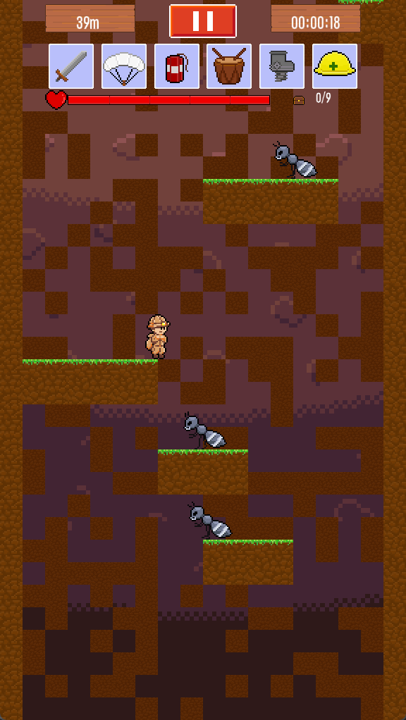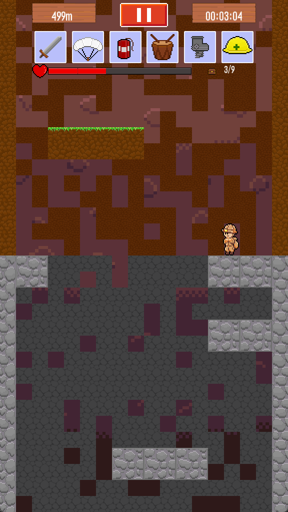 Fall-down platformer with Auto-generated stages. Obtain items to help your journey - but beware, you should only bring what you can lose.