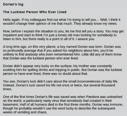 Uncover the intertwined destinies of Dorian, the luckiest man who ever lived, and Sheryll, a scientist who confronts the secrets of The Institute, and piece together your role in this expansive galaxy spanning sci-fi story.