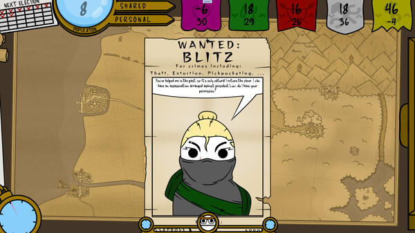 The game consists out of two distinct phases: personal turns and shared turns. During shared turns, you and your fellow presidents must vote together on presented dilemmas, impacting the Republic's four main resources—food, military, raw materials, and currency—along with the population amount and their happiness. Balancing these factors is crucial to ensuring the Republic's and your own survival. The personal turns present dilemmas exclusively to you, affecting your personal resources, your approval rating and your voting power during shared turns. These personal turns also offers a strategic opportunity to scheme against, steal from, trade with, or spy on fellow presidents.The end goal is to secure re-election as the sole president. Your approval rating and reputation with each location are pivotal in determining your score during the next election. However, only looking out for yourself and your own approval might anger the other presidents.