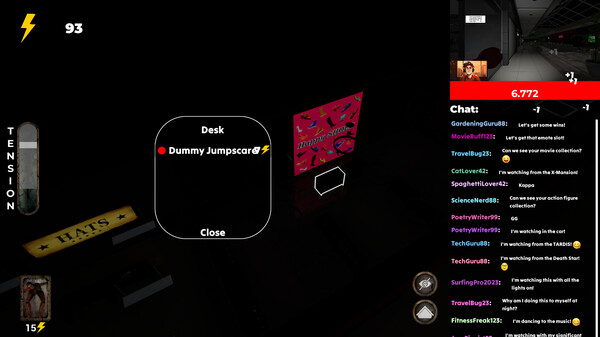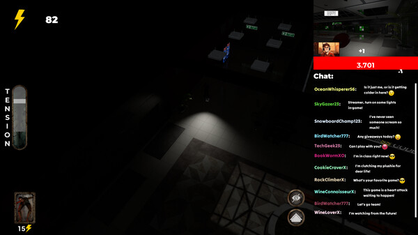 You start with a set amount of energy. based on the difficulty settings Your job is to strategically build up tension to then scare the streamer. When you have a good harmony of tension and scares, the viewer count will increase as the stream is very entertaining. With more viewers, you can get more energy to continue the game.
