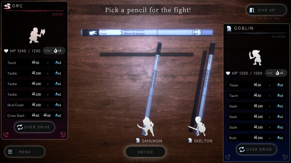 --Start each battle with 3 randomly selected pencils. Choose one of them and fight against the great heroes!