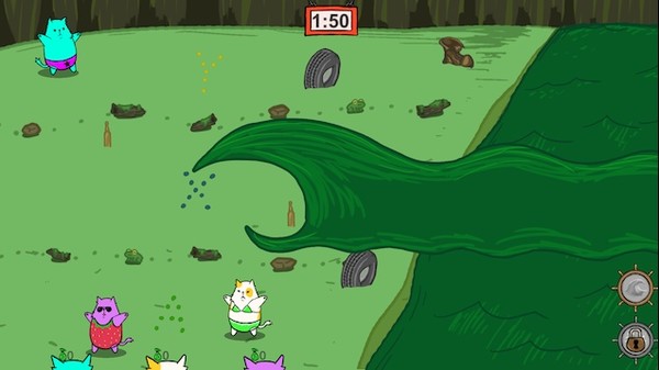The game has Whiskered Away is an asymmetrical 2D party game where three players play as cats and compete to collect "shinies". Meanwhile another player as Poseidon attempts to stop the cats from stealing his treasure through godly means. The cats must avoid Poseidon's powers and survive until the time runs out.