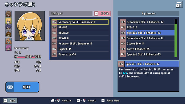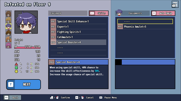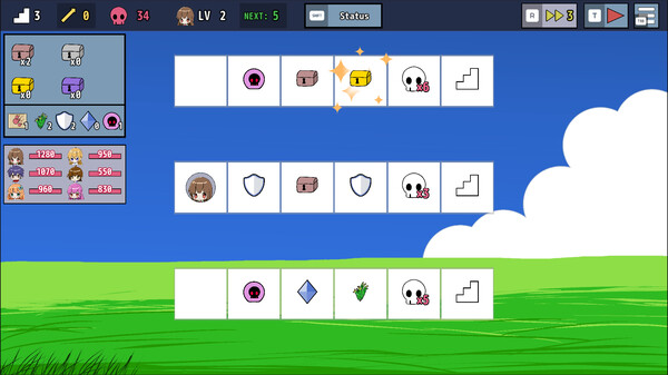 Every four floors, you can open treasure chests to update your characters' equipment (which provides passive effects). Enhance your stats or adjust the probability of skill usage to create your own unique build.