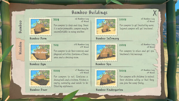 Build facilities such as a dorm and gym, craft camp items, and optimize resources to keep the camp running smoothly.