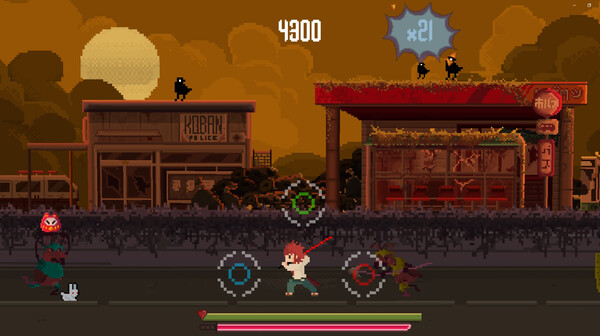 The game has RedDrop is a frantic rhythm game with pixel art style, where you must fight alongside Ren to rescue his sister Aiko. She has been captured by Haka, a former Kyoshi monk corrupted by the malevolent influence of the Reddrop katana, plunging Japan into an era of darkness and fear by creating an army of demonic ants that torment the city.