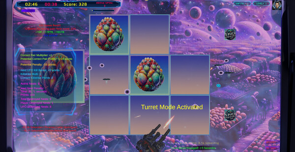 For each successful pair, you unlock turret mode. Use this opportunity to shoot down UFOs, gain extra time, and boost your score.