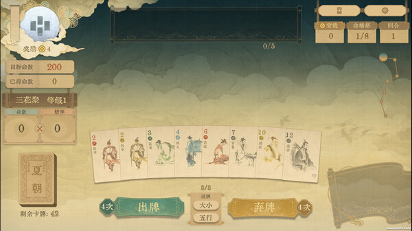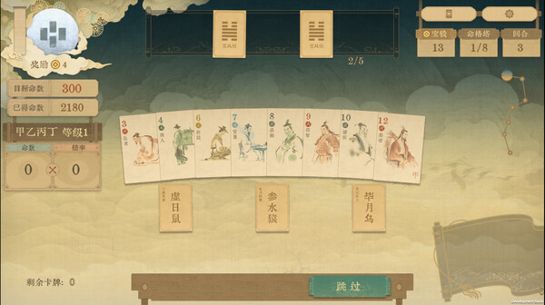 2、Players must strategically play their character cards to reach the “Fate Number” set by the “Heavenly Veil.” The “Heavenly Veil” acts as the player's opponent, randomly generating negative effects to hinder the player's progress!