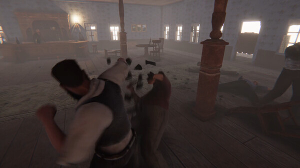You can throw different punches and kicks or you can grapple your opponent in combat. You can also grab glass bottles and swing or throw them to your enemies. Characters have active physics and ragdoll system all the time so all the characters reacts to hits realistically, you can even hit the pianist or the bartender. Damage is depend on physics as well so timing your punches and positioning your character is very important. You can also block your opponent's attacks but if you can't position your character well a punch can hit you. Use the environment to your advantage is also important since there are lots of bottles chairs and table in the saloon.