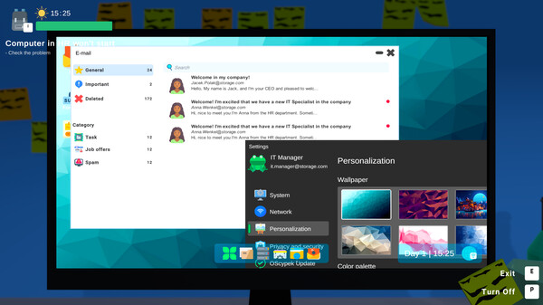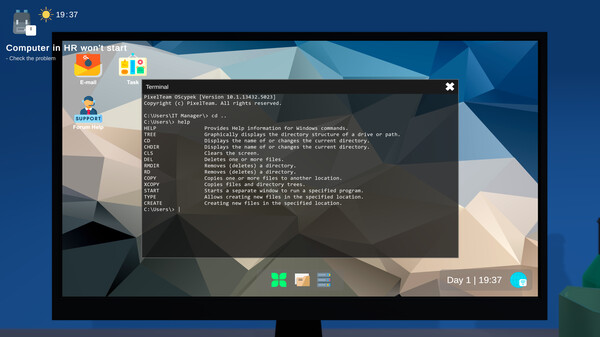 Step into the role of a student embarking on a career in IT. Solve network, hardware, and software issues. Manage servers and users, and discover your own path to growth and development!