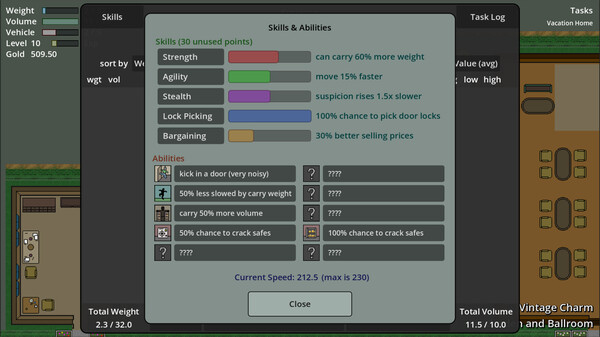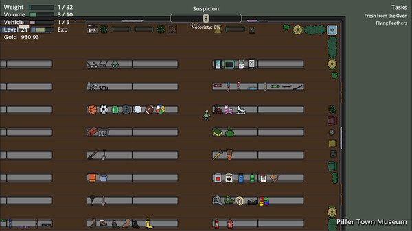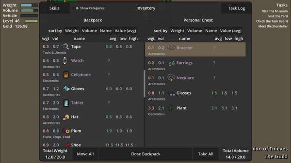 A big part of the game is choosing what to steal. You can't carry it all. Do you look for specific items for a current mission? Or do you choose the items with the highest value? You don't know the value until you talk to the fencer, but you'll remember the range of values you've seen before for an item. Then you also have to think about weight and volume. Some things are heavier or take up more space. Do you choose to steal a few large valuable items or many small cheap items? Just watch out for cheap items that are large or heavy. The best is a small, valuable item. But you might not be able to sell those right away.