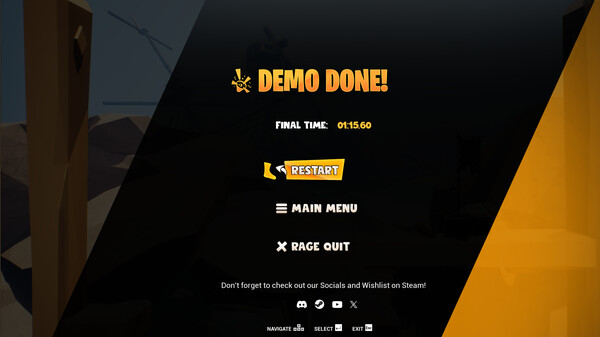 Once you make it to the end of the demo, you get your final time. This is only for the demo, the full game has an actual ending, so don't worry! The full game also contains more biomes to be challenged in, being that it is one continuous world!